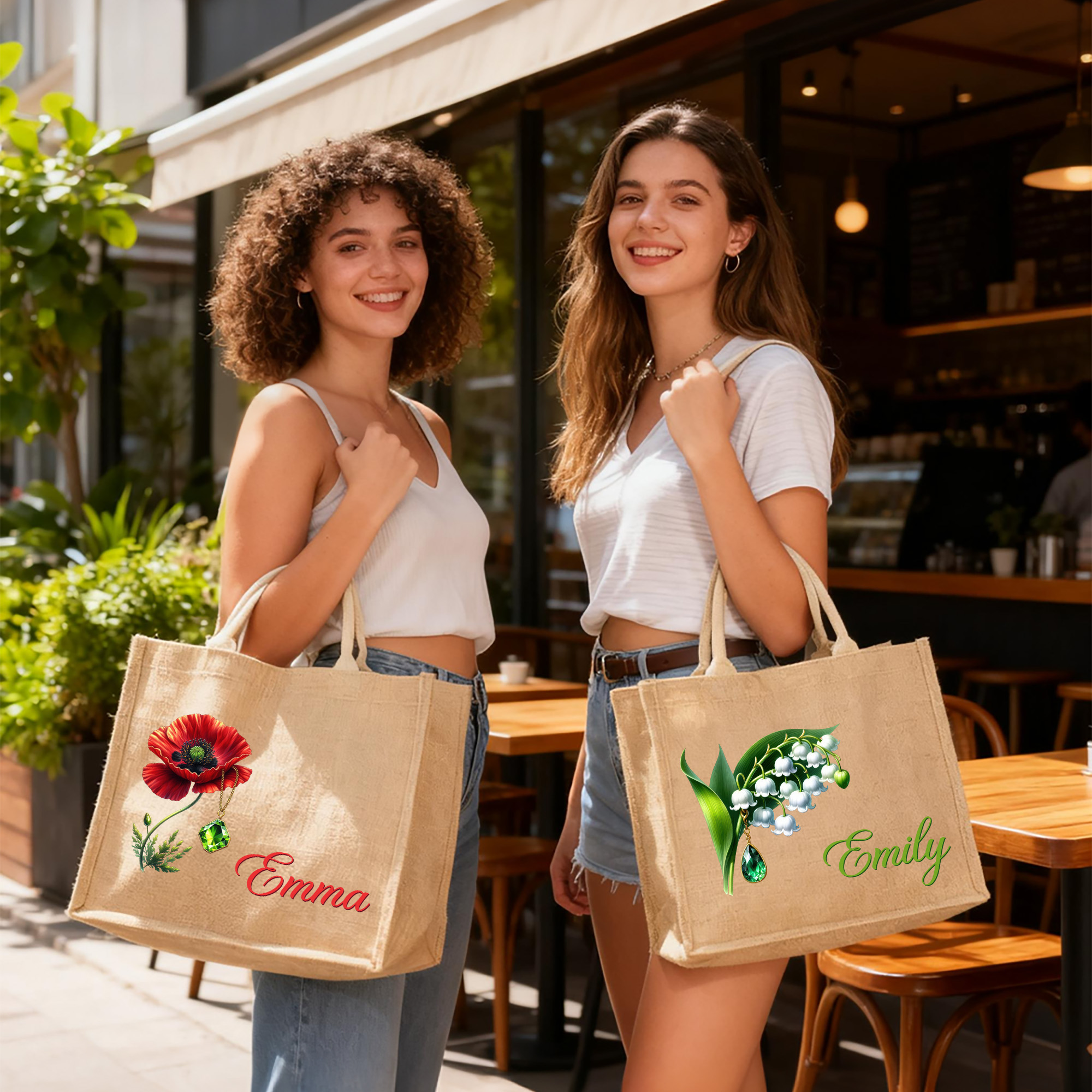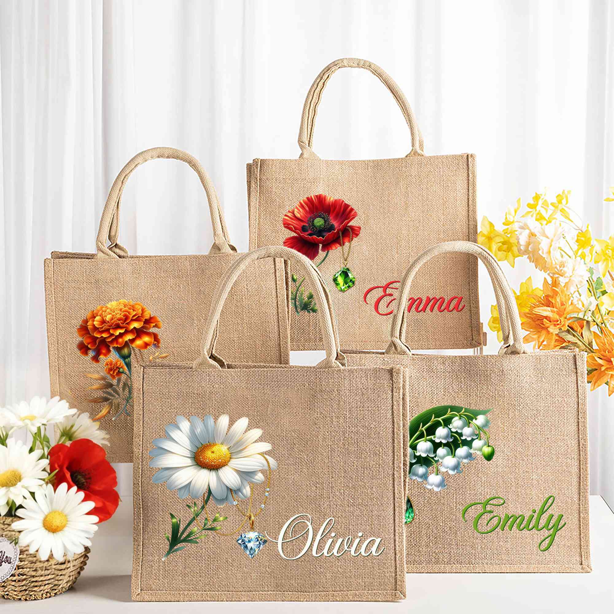 Personalized Name Gemstone Birth Flower Tote Bag, Large Capacity Jute Bag, Burlap Beach Bag, Bridal Shower Favor, Birthday Gift for Her/Mom/Women