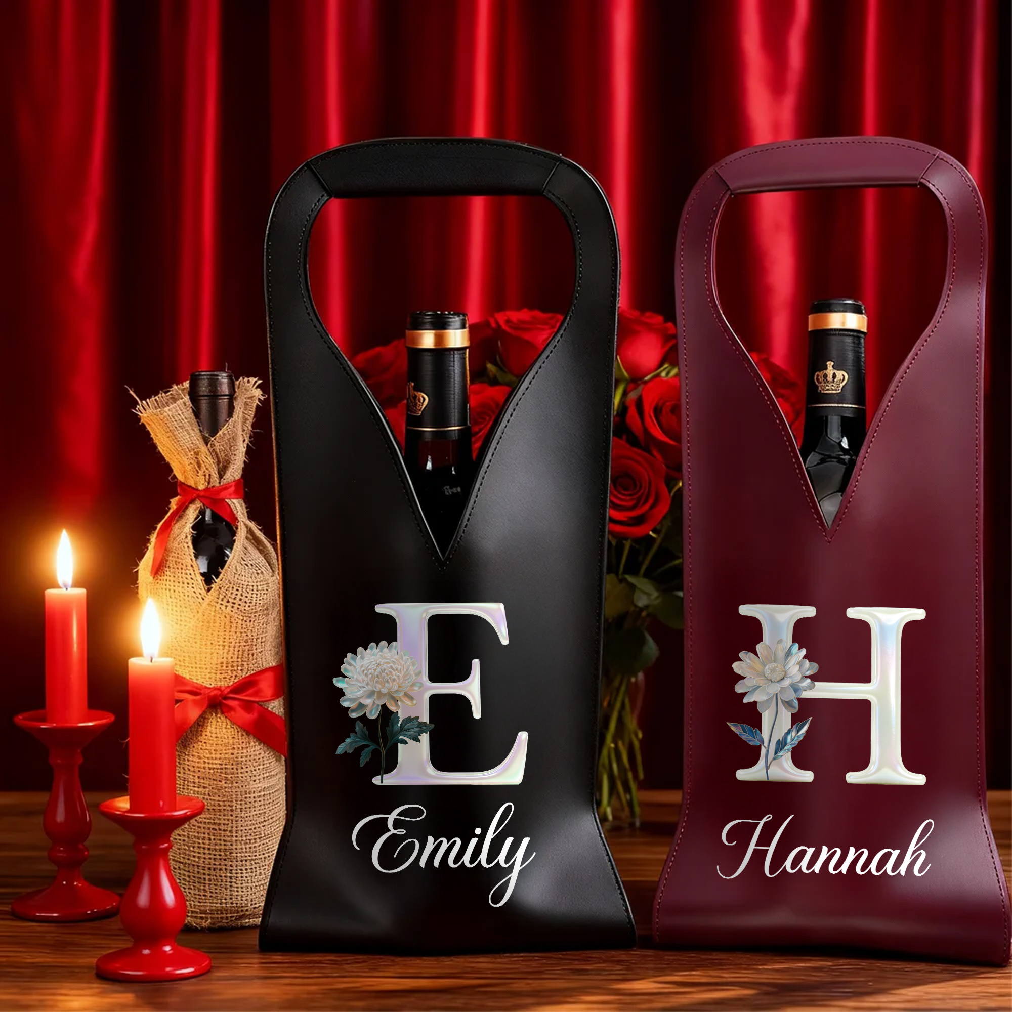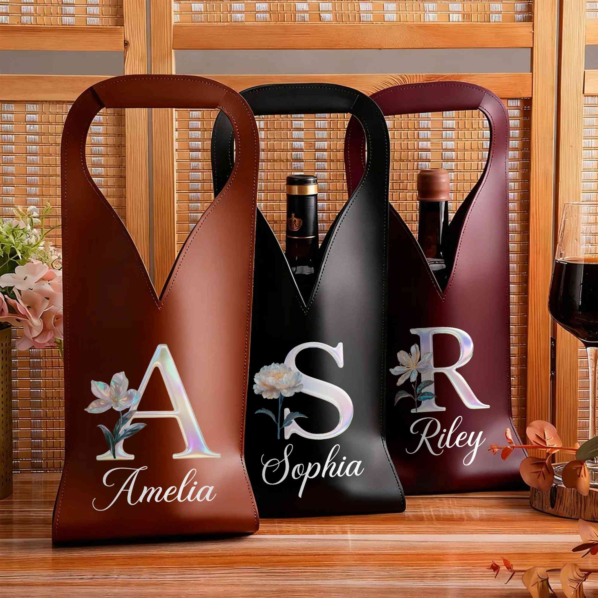 Personalized Name Mother of Pearl Initial Birth Flower Wine Tote, Leather Wine Carrier Bag, Housewarming/Christmas Gift for Wine Lovers/Family/Friends