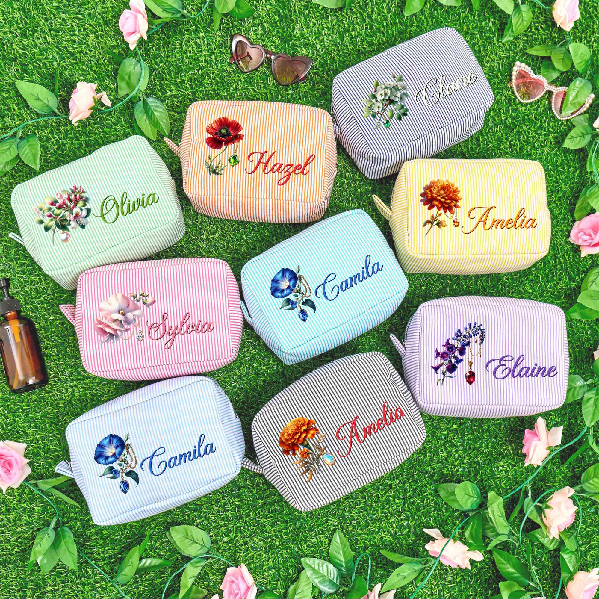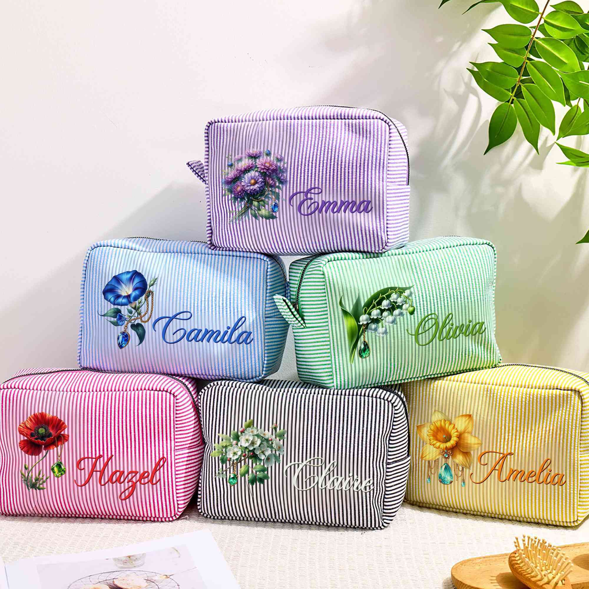 Personalized Name Gemstone Birth Flower Striped Makeup Bag, Travel Cosmetic Bag, Birthday/Mother's Day/Wedding Gift for Her/Mom/Bridesmaids/Women