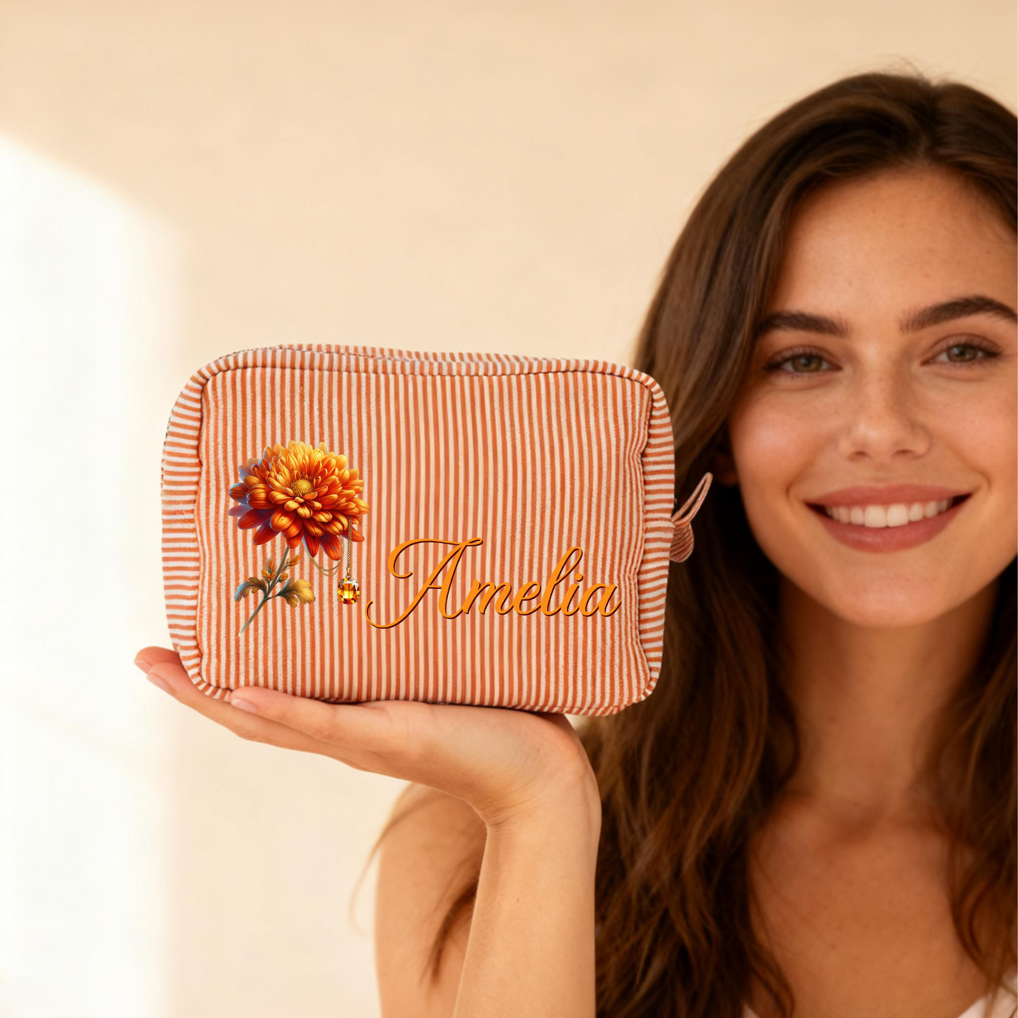 Custom Elegant Design - This cosmetic bag showcases a timeless striped palette paired with a beautifully illustrated floral motif. The birth flower is accented with gemstone-style details for a charming vintage touch. Add your name to turn it into a personal accessory that suits your own style.
